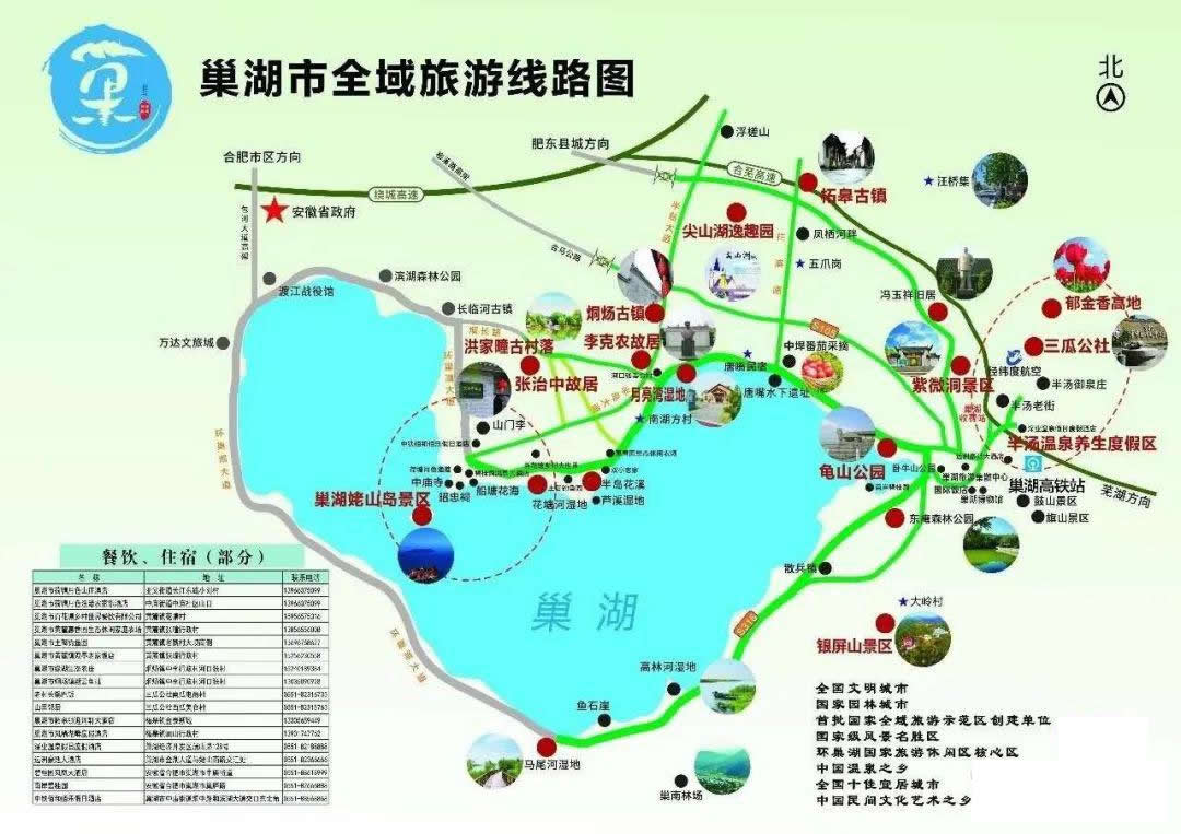 其中代表性景點有紫微洞、銀屏山、龜山、四頂山、巢湖濕地、東庵森林公園、平頂山“金釘子”、巢湖魚龍化石、紅石咀、黑石咀等,紫微洞為國家AAAA級景區(qū),銀屏山、中廟-姥山島為國家AAA級景區(qū)并正積極爭創(chuàng)國家AAAA級景區(qū)。