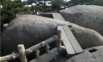 天池峰,為天柱山的第二高峰,它稍高于飛來(lái)峰,海拔1426米。天池峰,一裂為三,由兩段石條連接在一起,稱為“渡仙橋”,登上天池峰頂,可觀日出、云海、佛光、晚霞景觀?邕^(guò)渡仙橋,即達(dá)方圓不足10平方米的一平臺(tái),臺(tái)中大小兩個(gè)石坑,稱“天池”。天池平臺(tái)外沿是懸崖絕壁,稱試心崖。試心崖可觀賞“天柱山佛光”景觀。