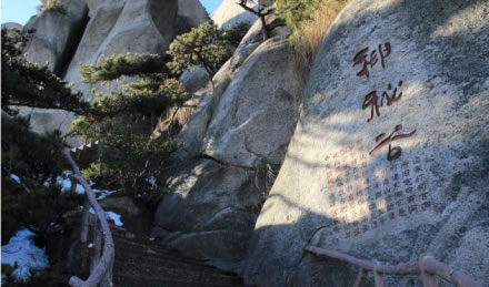神秘谷,在天池峰南,又稱司元(玄)洞。神秘谷石由龍宮、迷宮、逍遙宮等組成,自龍吟虎嘯崖入口,穿過(guò)五指峰,緊傍飛來(lái)峰,環(huán)繞銜珠峰,直達(dá)渡仙橋,全長(zhǎng)400多米,落差100多米。谷內(nèi)洞上有洞,洞里有洞,有的相連,有的間隔,道家視此地為洞天福地,道書稱之為第十四洞天。舊志稱此洞“空邃可容萬(wàn)余武,下有水晶巖,直通滄海。后呼為總官洞!