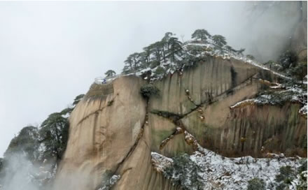 天池峰側(cè)畔的懸崖之間,屹立著一株高大的松樹。這棵天柱松長(zhǎng)在千米高的石壁上,石壁面向天柱峰與飛來(lái)峰,天柱松依山崖而長(zhǎng),松高不過(guò)5米,粗不過(guò)80公分,可據(jù)勘測(cè)它有1500多年的歷史。