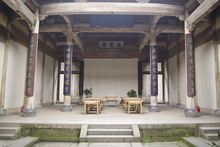 前廳是整幢房子中最精華的部分,大門(mén)后面聳立著一幅威儀的中門(mén),在中門(mén)“!弊值纳戏剑傆幸环镜瘛鞍僮郁[元宵”圖,圖上雕刻著100個(gè)小男孩過(guò)元宵鬧花燈時(shí)的情景,這正是古代“多子多!眰鹘y(tǒng)觀念的生動(dòng)寫(xiě)照,“百子鬧元宵”圖兩邊的“商”字斗拱上則分別雕有四出《三國(guó)演義》的戲文,斗拱的上方雕有“南、北”財(cái)神,“南、北”財(cái)神的上方是閣樓護(hù)板,在此,汪定貴設(shè)計(jì)了“漁、樵、耕、讀”四根木雕立柱,分別代表了古代的四種職業(yè)。