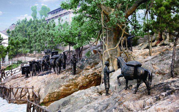 五千年文博園復(fù)原茶馬古道滇藏路線一段,設(shè)麗江客棧、香格里拉客棧,長(zhǎng)500米。古道依山體而建,以人物雕塑、實(shí)景微縮的形式,打造出馬幫、背夫、牦牛在崇山峻嶺間穿梭,翻山越嶺、長(zhǎng)途跋涉的意境。形象逼真、栩栩如生,再現(xiàn)了辛勤的馬幫日復(fù)一日、年復(fù)一年,用生與死開(kāi)辟出一條通往域外的經(jīng)貿(mào)之路,一條人文精神的超越之路,也因此歌頌?zāi)切椴貪h民族的團(tuán)結(jié)和興旺作出貢獻(xiàn)的人們。