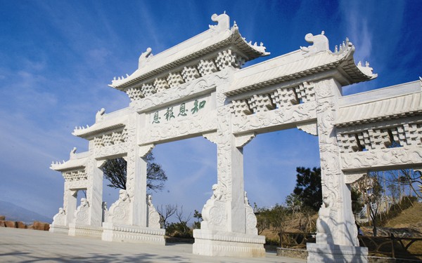 牌坊,一種中國(guó)特有的門(mén)洞式建筑,《現(xiàn)代漢語(yǔ)詞典》解釋為“形狀像牌樓的建筑物,舊時(shí)多用來(lái)表彰忠孝節(jié)義的人物”,現(xiàn)被視為中華文化的一個(gè)典型標(biāo)志。位于五千年文博園標(biāo)志性建筑盤(pán)龍下方的牌坊高9.6米,寬28米,以草白玉為材質(zhì),石砌整塊雕刻而成,上刻有趙樸初先生書(shū)法體“知恩報(bào)恩”四字,以此四字為做人準(zhǔn)則,來(lái)回報(bào)社會(huì)。