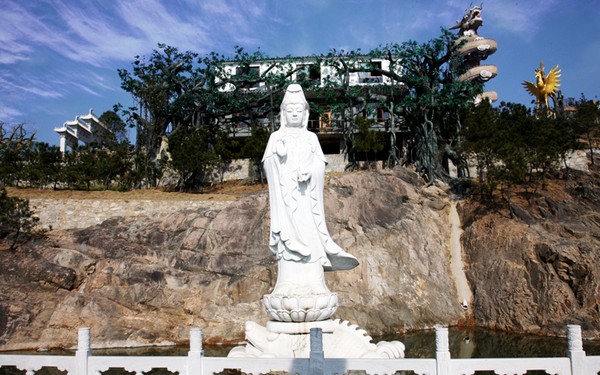 矗立于五千年文化長(zhǎng)廊的滴水觀音塑像,其高16米,由草白玉雕刻而成。她腳踩鰲魚(yú),衣袖流暢,手持凈瓶,凈瓶盛裝著甘露,略帶笑意,具有無(wú)量的智慧和神通,普救人間疾苦。她的慈光,如同一輪皎潔的皓月,高懸夜空,普照大地,護(hù)佑著苦難眾生;其凈瓶中的甘露永流不息,滴水聲仿佛在向游人展示把那甘露灑至世界每一角落,流進(jìn)人們的心理,凈化世人的心靈,故有‘戶戶阿彌陀,家家觀世音!’的贊語(yǔ)。文博園的滴水觀音大氣端莊,生動(dòng)傳神,具有濃厚的民族性,是人類珍貴的文化藝術(shù)瑰寶。