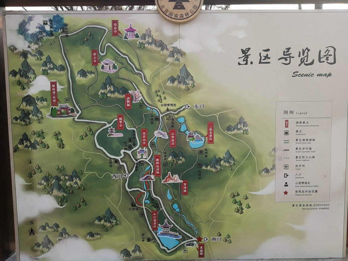 北京北宮國家森林公園,位于北京市豐臺區(qū)西北部山區(qū),距北京市中心20公里,是丘陵型自然風景區(qū)。北宮因帝王憩地而得名。公園始建于2002年10月,2005年12月被國家林業(yè)局正式批準為國家級森林公園。公園總面積9.145平方公里,由東部、西部和中部三大景區(qū)和北宮山莊、茗盛樓兩組近10000平方米的配套設施組成。園內(nèi)有12處亭、廊、閣、塔等人文景觀,以及芳澤溪、小江南、楓林路、樺林溝等15處景點。綠化美化面積3000畝,優(yōu)質(zhì)樹種21種3.6萬株,野生花卉30余種5萬余平方米,園內(nèi)植物種類達到253種,形成了首都西部生態(tài)建設中的亮點。