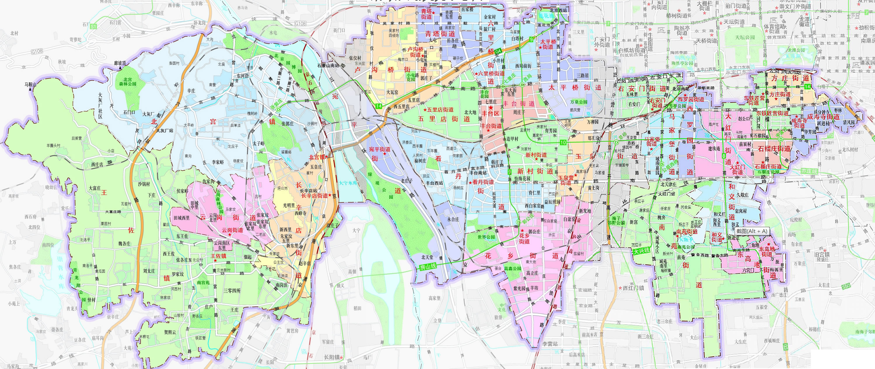 豐臺(tái)區(qū)轄24個(gè)街道、2個(gè)鎮(zhèn):