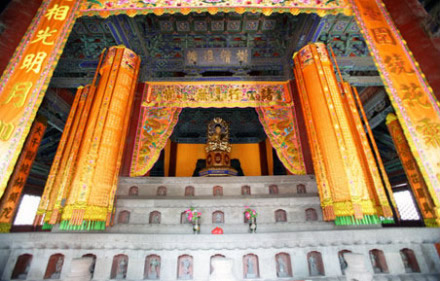 大雄寶殿:在天王殿后面,坐落在近兩米高的月臺(tái)上。門額上高懸清乾隆帝手書“蓮界香林”雕龍橫匾。原來還掛有清康熙帝所題“般若無照” 匾額和“禪心似鏡留明月,松韻如莫振舞風(fēng)”的楹聯(lián),今已不存。殿內(nèi)屋頂上有三個(gè)木雕藻井,上圓下方,井內(nèi)各雕有一條團(tuán)龍。下方漢白玉石雕的須彌座上供有明代鑄造的銅質(zhì)橫三世佛。正中為釋迦牟尼佛,南側(cè)為阿彌陀佛。北側(cè)為藥師佛。每尊佛像高3.2米,重5000公斤。大殿前左右兩側(cè)各有三間配殿,左側(cè)為伽藍(lán)殿,右側(cè)為祖師殿。