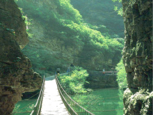 棧道:京東大峽谷以五潭稱奇,然而跨四潭的棧道也稱標(biāo)新立異,各不相同,成為大峽谷的又一奇觀,一、二棧道依崖而成,似長龍臥坡,四潭棧道由數(shù)十根鋼索相連而成,攀崖而上,跨潭而過,似臥頂長虹,走在上面搖搖晃晃,險象橫生,難免不讓人想起紅軍強(qiáng)渡“大渡河”、勇過鐵索橋的壯舉,游客們身臨其境,其感覺自當(dāng)終生難忘。