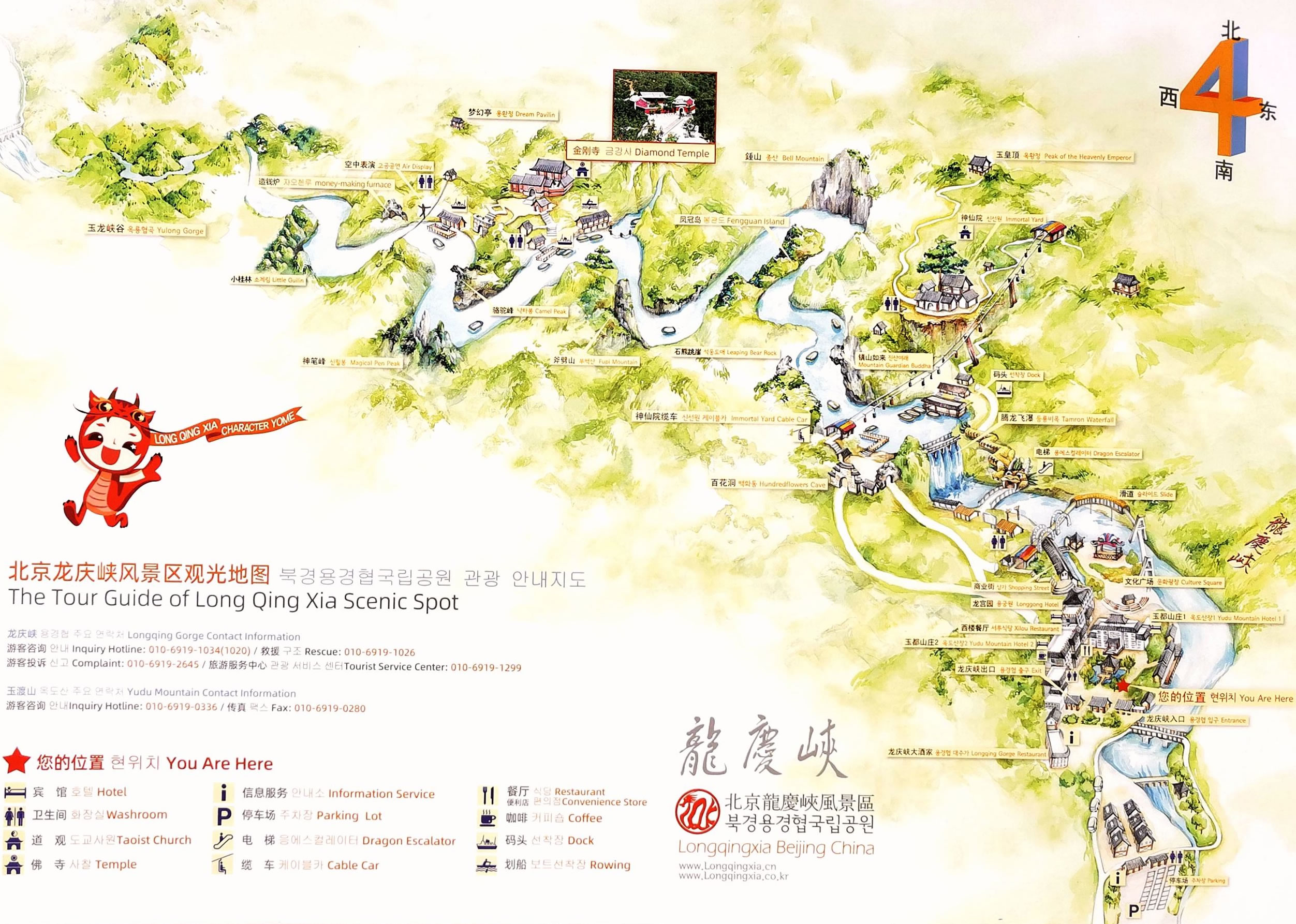 1986年北京評選十六景,得票居第十位,取其古地名兼寓龍騰之意,定名“龍慶峽”。龍慶峽南面為八達嶺長城,西北為松山森林公園,正西是海坨山。7月份平均氣溫比延慶縣城低2.9度,比北京城區(qū)低6.4度。在已開放游覽的7公里長的庫區(qū),共有20-30處景觀。游船駛抵“九曲湖”的一座小碼頭,可以棄舟登岸,沿山谷步行而上,有神仙院、仙人棋、老虎嘴等景點。