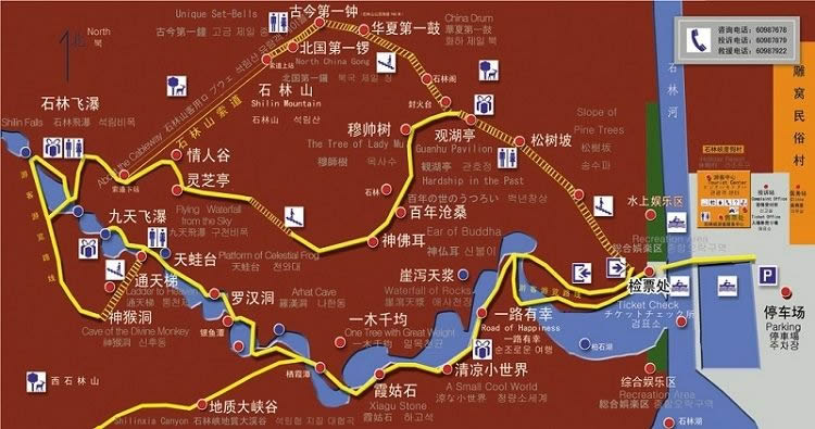 六是靈潭,谷中有潭水十余處,其水四季不竭,如一串秀麗的珠璉,為石林峽增添不盡的秀色。