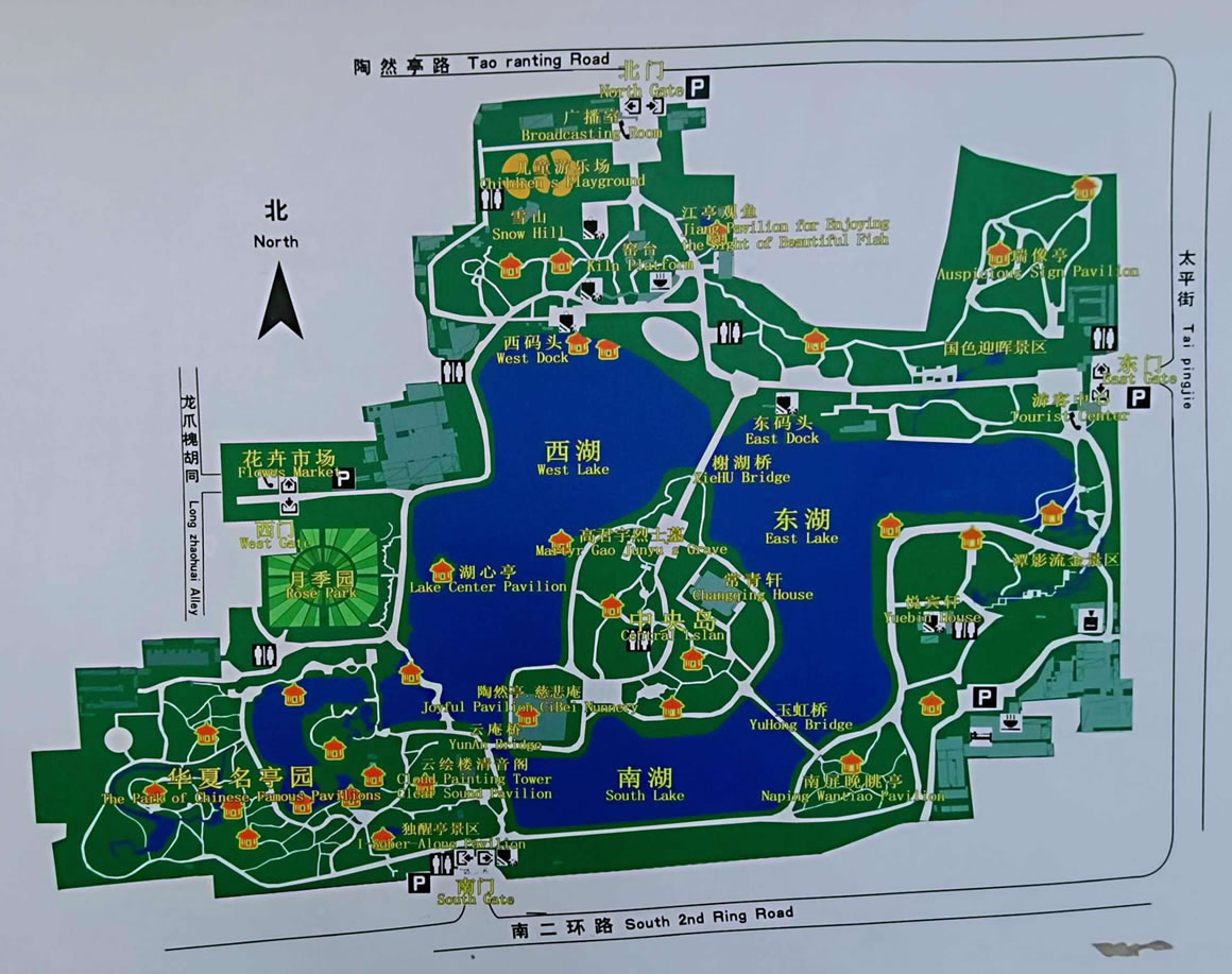 陶然亭公園內(nèi)有勝春山房景區(qū)、華夏名亭景區(qū)、陶然佳境景區(qū)、陶然佳境景區(qū)、潭影流金景區(qū)等各具特色的景區(qū)。其中著名的陶然亭位于湖中央島的陶然佳境景區(qū),陶然亭周圍,有許多著名的歷史勝跡。西北有龍樹寺,寺內(nèi)有蒹葭簃、天倪閣、看山樓、抱冰堂等建筑,堪與陶然亭相匹。東南有黑龍?zhí)、龍王亭、哪吒廟、刺梅園、祖園;西南有風(fēng)氏園;正北有窯臺(tái);東北有香冢、鸚鵡冢,以及近代的醉郭墓、賽金花墓等。這些歷史勝跡產(chǎn)生年代多早于陶然亭,有的甚至早于慈悲庵。它們都有文人墨客觴詠的歷史,曾現(xiàn)過各領(lǐng)風(fēng)騷的輝煌時(shí)期。