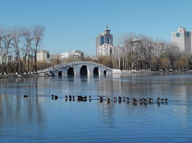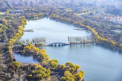 引水湖在公園東北部,有一幽靜湖區(qū),原來為林木囤養(yǎng)區(qū),植被繁茂。隨著公園環(huán)路的建設(shè),這個占地9.5公頃,地勢低洼的林區(qū),在1997、1998年被大規(guī);靥罡脑。該景區(qū)的水系是自東湖而來,至釣魚臺而去。北部地形舒緩開闊,以雪松,銀杏和挺拔的白楊等喬木為主,散布于開闊的草坪,沿公園環(huán)湖路北,配以海棠等春花灌木帶,極具90年代的疏林草地風(fēng)格。