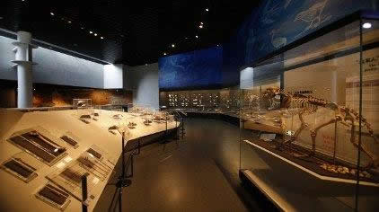 第三展廳主要介紹龍骨山上發(fā)現(xiàn)的二十余處脊椎動物化石遺址和古人類活動過的遺址分布點(diǎn),以及一件18000年前山頂洞人的遺物——串青貝殼,獸牙、小石頭制成的古老的項(xiàng)鏈。