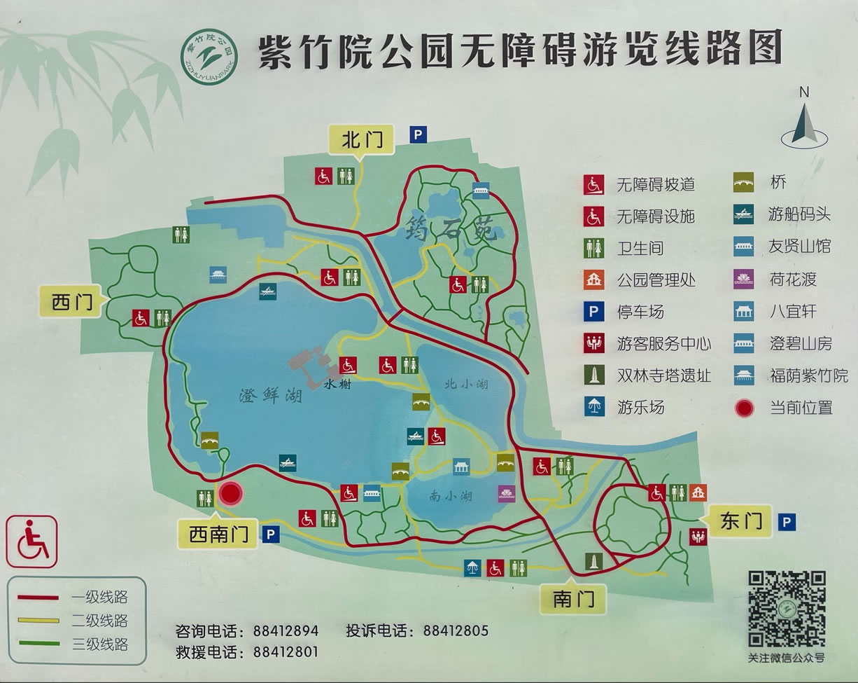 紫竹院公園占地47.35萬(wàn)平方米,其中水面18.9萬(wàn)平方米,水面約占三分之一。南長(zhǎng)河、雙紫渠穿園而過(guò),形成“三湖兩島一堤”的基本格局,是一座翠涌芳島,篁映碧波,以竹取勝,以竹為景的自然山水園林。分為綠毯詩(shī)韻、青蓮島、明月島、筠石苑等景一片蓄水湖,公元三世紀(jì)時(shí),這里是高梁河的發(fā)源地,系燕京水源之一。明代萬(wàn)歷五年(1577年),在湖北岸興建紫竹院廟宇,為萬(wàn)壽寺的下院。全園占地47.35公頃,其中水面占18.9公頃。園中有大小湖泊三個(gè),兩座小島,五座拱橋把湖、島、岸連在一起,橋、廊、亭、榭,點(diǎn)綴其間,紫竹院公園以竹景取勝。過(guò)去傳說(shuō)觀音菩薩居住在南海紫竹林,這里一建有供奉觀音的寺廟而得名。共栽有10余種竹子,16萬(wàn)余株,成為一座以水景為主,以竹景取勝,深具江南園林特色的大型公園。 1999年開(kāi)通的京城到頤和園水上旅游線,這里是必經(jīng)之路。 健身旅游賞景的好地方。