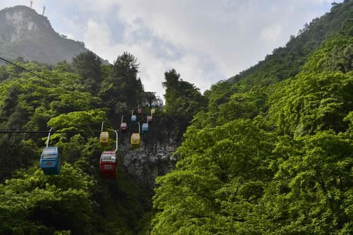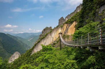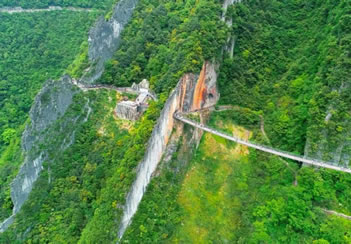 舍身崖位于情人谷尾部,海拔300~600米,因流水侵蝕作用,導致崖壁裂縫薄弱面巖石發(fā)生崩塌形成陡峭壁立的山崖。