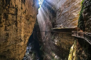 青天峽地縫全長1500米,最窄處不到2米,兩岸懸崖峭壁,高度300~700米,抬頭僅見天光一線。地縫中怪石林立,鐘乳石千姿百態(tài),兩壁峭崖有的地方僅隔數(shù)尺。當雨過天晴或正午陽光朗照,陽光穿透地縫,與崖壁上的流水發(fā)生折射后會形成“一米陽光”奇觀。