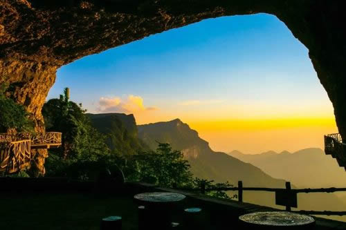 古佛洞位于山頂部位藥池壩東北側(cè),海拔2100米。進(jìn)洞口高約5米,寬3米,經(jīng)洞左狹窄通道進(jìn)入有1公頃大的“大廳”,內(nèi)有古佛、石棺材、米市、戲樓等景點(diǎn)。左行400余米,洞穴逐漸收縮,形成人工隧道似的大通道,斜上出洞,出口在金佛山正北絕壁上,洞高約20多米,寬約40米,呈月牙形,極目遠(yuǎn)眺,北坡峰巒盡在腳下,南川城區(qū)歷歷在目。經(jīng)探測(cè),洞分上、下兩層,上層長(zhǎng)1072米,面積46公頃,另有支洞8條,網(wǎng)狀分布,總長(zhǎng)1112米;下層狹窄曲折,另有朝南的狹小出口。
