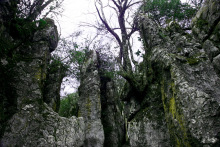 生態(tài)石林位于藥池壩南約1000米處,有一片郁郁蔥蔥森林掩蓋下的石林。巖石出露地表幾米或十幾米,石上苔蘚厚重,立石頂部、間隙雜樹叢生,黃楊、杜鵑、紅豆杉等繁茂生長(zhǎng),10公頃范圍內(nèi)若天然盆景園。
