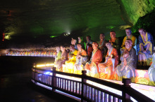 煙云洞位于三泉鎮(zhèn)觀霞山,海拔1040米。每至冬春,有白色霧氣從洞口飄散而出,故名“煙云洞”,形成于中生代三疊紀(jì),距今約1.8億年。洞內(nèi)鐘乳石密集,洞呈環(huán)形,長(zhǎng)800余米,進(jìn)、出洞口各一,下進(jìn)上出。進(jìn)口為人工開鑿的拱形隧道,高2米,寬1.8米,長(zhǎng)27米。洞內(nèi)可分為金佛殿、水晶宮、千塔林、降龍洞、洗象池、九柱門廊、禹王執(zhí)圭、仙人田、金獅送客9個(gè)景段。出口為原生洞口,沿金佛殿洞壁斜上而出。