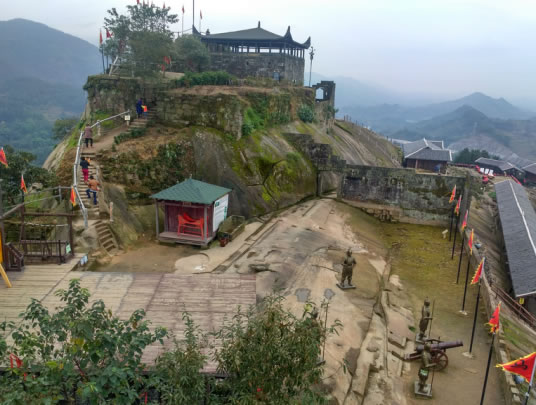 滑石寨位于金帶鎮(zhèn)滑石村3組,是平壩上突兀拔起的一座高260多米的孤峰。孤峰呈紡錘形,四周皆是懸崖峭壁,峰頂平地有6000平方米左右。峰西是一堵傾斜約75度、近10萬(wàn)平方米的完整石壁,石壁上鑿有一條寬不盈尺的之字形石階,它是通達(dá)寨上的惟一路徑。從山下到寨上要走1個(gè)多小時(shí)路程,其中要經(jīng)過(guò)2000多級(jí)在石壁上開鑿的石階,山腰到山頂分別有兩道寨門把守。記者在現(xiàn)場(chǎng)看到,山腰一道寨門門楣上清晰刻寫著“未雨,嘉慶二年十月立”字樣。登上寨頂,數(shù)十間木質(zhì)結(jié)構(gòu)的房瓦痕跡依稀可見,青石砌的寨門和寨堡仍保存完好,四道墻體上都開有射擊孔。整個(gè)寨堡耗石約1萬(wàn)多方,工程浩大,令人稱奇。