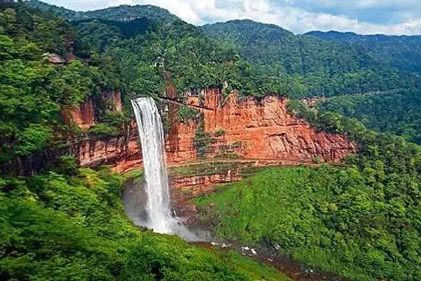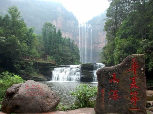 一雄一雌,一南一西,對巖相望,故名鴛鴦瀑布。南瀑高110.82米,為雄瀑,瀑水時(shí)而懸垂跌落,時(shí)而貼臂滑流;西瀑高90.25米,是雌瀑,瀑水絲絲縷縷,猶如戀人的情絲。雙瀑相望,一路飛珠涌向?qū)Ψ,最后在谷底融為一體,向北而去。
