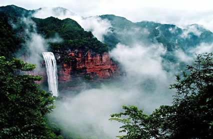土地巖瀑布在土地巖壁畫對面,如一潔凈的白緞懸垂而下。瀑布高89米,寬25米,懸垂于綠樹紅巖之中,三面赤壁環(huán)繞,與巨幅丹霞赤壁兩相呼應(yīng),形成四山鎖絕谷、一水落幽林、綠樹映湖色、丹霞醉畫屏的絕景。