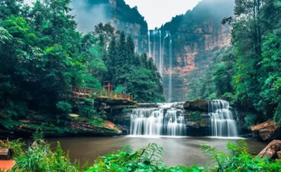 三道拐瀑布是四面山最美的瀑布之一,瀑布不高,但造型奇特,三次跌落三次成瀑,是四面山少見的三級瀑布。瀑布處白水丹巖,古樹藤蘿,綠樹紅花,黑石溪流,在瀑布下仿若人在畫中游。