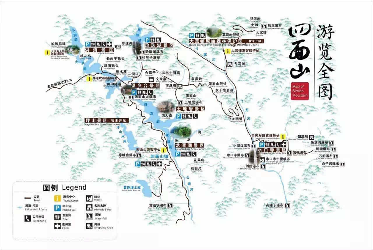 龍?zhí)逗䴙樽匀缓,左鄰四面山景區(qū)大門,右靠壁立陡峭的畫屏山。湖面海拔900米,長近3000米,寬100米,最深處22米,湖水清澈晶瑩,湖岸樹木蔥郁。