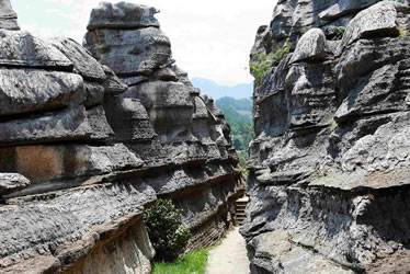 是因?yàn)閹r溶塌陷,石頭斷裂而成的峽谷。石林東部并行排列三個(gè)石峽,分別稱為“蓮花峽、鳥鳴峽、聽泉峽”。三峽中最引人入勝的當(dāng)數(shù)聽泉峽,長達(dá)300米左右,而寬則在1—2米之間,最深80米左右。站立其中,仰頭觀望,只見一線藍(lán)天,就像一綹藍(lán)帶飄過頭頂。兩邊懸崖若削,高聳壁立,氣勢(shì)恢宏。兩面絕壁,均由大小形狀相似、重達(dá)數(shù)十噸的巨石塊組成。石塊間縫隙規(guī)矩,有若人工而成的古城墻一般。無論什么時(shí)候,都有水滴從巖壁上不停歇地滴落。這時(shí)候,不管外面溫度多高,這里都涼意襲人。
