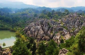 以地表石林為代表的典型的喀斯特地貌景觀十分吸引人。該類景觀表面呈虎皮狀,形成一系列各不相同的觀賞景點(diǎn)。在這里,群峰壁立,奇峰危石,可謂千姿百態(tài),石門、石寨、石柱等,酷似人工堆疊,卻無人工痕 跡;飛禽走獸的石頭,栩栩如生、惟妙惟肖;田園阡陌、炊煙裊裊,清泉碧池、懸崖雪瀑,白鶴青 、 碧空鳥語,清麗若未施粉黛的閨秀楚楚動(dòng)人。其主要景觀有情朗峰、香爐山、巨扇、地縫一線天、化石 、石鼓、將軍石等數(shù)十處。顯示出萬盛石林景觀的美感與靈性。