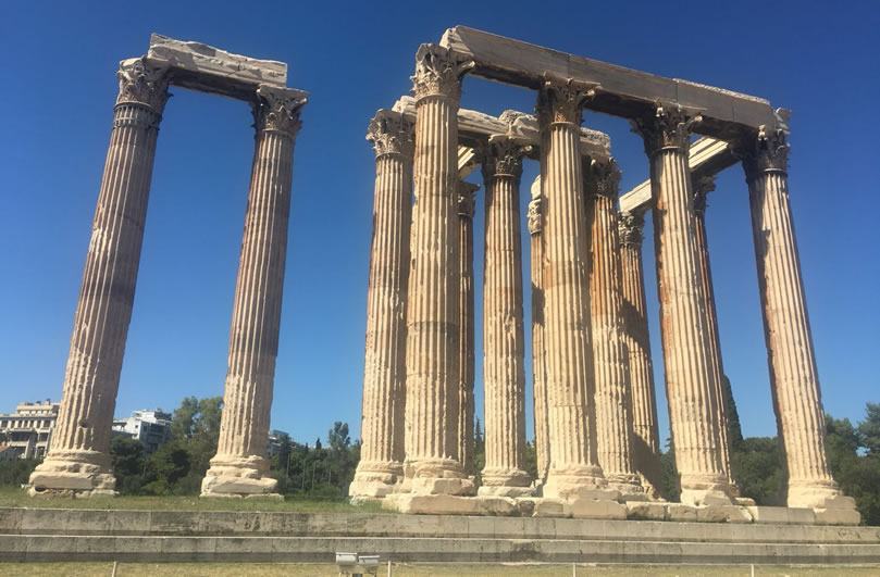 宙斯神廟 宙斯神廟位于希臘雅典衛(wèi)城東南面,是為了祭祀宙斯而建的,也是古希臘最大的神廟。宙斯神廟建于公元前470年,于公元前456年完工,由建筑師Libon設(shè)計,宙斯神像則由雕刻家菲狄亞斯負(fù)責(zé)。直到公元前86年,羅馬指揮官蘇拉(Sulla)攻占雅典,破壞了尚未完成的建筑,將一部分石柱和其他建材拆下來之后,運(yùn)到羅馬。直到今天,在羅馬市中心的古羅馬廣場遺址上,還能看見它們。宙斯廟尤以象牙和黃金的塑像而聞名于世。 宙斯神廟是伊奧尼亞風(fēng)格的建筑,后來改用了科林斯式石柱風(fēng)格,而且一概使用大理石。整個建筑坐落在一塊205米長,130米寬的地基上,神廟本身長107.75米,寬41米,共有104根科林斯柱。每根石柱高達(dá)17.25米,頂端直徑達(dá)1.3米,約計用大理石1.55萬噸。和眾多的古希臘神廟一樣,宙斯神廟也遭受嚴(yán)重的破壞,104根柱子中僅存13根。宙斯神廟和哈德良拱門隔路相望,宙斯神廟位于路南,而哈德良拱門則位于路北,這兩座建筑都是由距今1900多年前的羅馬帝國國王哈德良時期修建的。我們已經(jīng)無法看到宙斯神廟和哈德良拱門的原始形態(tài),只能通過斷壁殘垣來回憶當(dāng)時的輝煌。