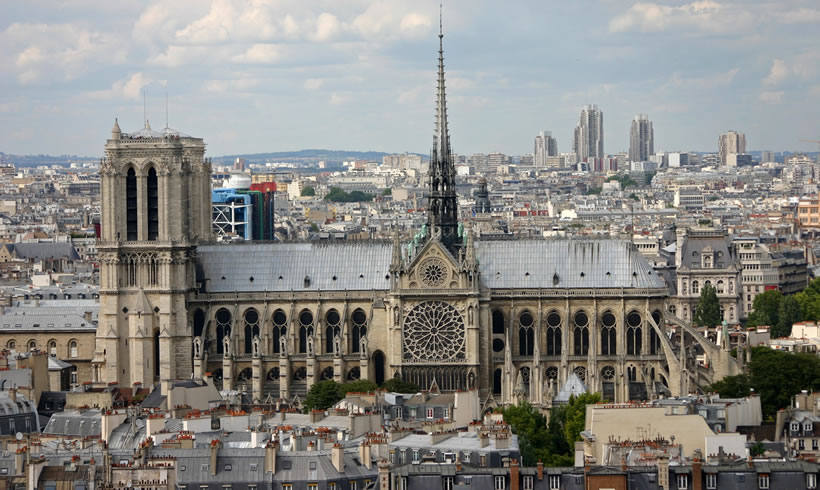 巴黎圣母院 巴黎圣母院(法語:Cathédrale Notre Dame de Paris),又名巴黎圣母主教座堂、巴黎圣母院大教堂,位于法蘭西共和國首都巴黎市中心城區(qū),地處塞納河中央西堤島上,與巴黎市政廳和盧浮宮隔河相望,為哥特式基督教教堂建筑;始建于1163年3月24日(羅馬教皇亞歷山大三世四年),是基督教支派天主教巴黎總教區(qū)主教座堂、法國首都最悠久和最具象征意義的紀念碑之一、歐洲最著名的哥特式大教堂之一、法國最具代表性的文物古跡和世界遺產(chǎn)之一,法國及歐洲文學(xué)文化地標(biāo)建筑。 巴黎圣母院平面為長形馬蹄哥特式拉丁十字形制,總長約127米,總寬約48米,總高達96米,總建筑面積達5500平方米,總占地面積達6000平方米;西立面置有兩座鐘塔,高約69米;內(nèi)部共有五個縱艙,包括一個中艙與兩側(cè)各兩個的翼艙,十字的頂部是祭壇,十字長翼是圣母院長方形主殿;東端是圣壇,后為半圓形的外墻,橫廳兩個盡段都有開門,旁置小塔;圣壇外有標(biāo)志性尖塔,高96米。巴黎圣母院是世界上第一座完全意義上的哥特式教堂,建筑本體的雕刻藝術(shù)和繪畫藝術(shù)及堂內(nèi)珍藏的大量藝術(shù)珍品具有極高的歷史文化價值和蜚聲中外的世界聲譽,是法國巴黎的象征,世界主流宗教基督教圣地。