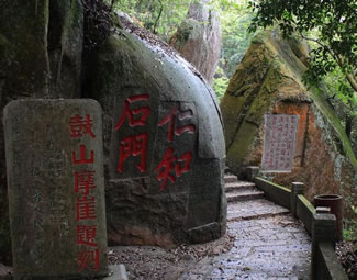 第四亭:“半山亭”。由第三亭至此,共有494級臺(tái)階。亭在半嶺,故名。過此亭百余階,有石刻“路通仙苑”,轉(zhuǎn)小徑可達(dá)“十八洞景”。“半山亭”后近300階有石刻“桃?guī)r洞口”,往東可到桃?guī)r洞,桃花精舍。