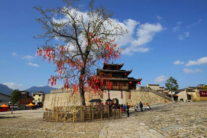 和平古鎮(zhèn)現(xiàn)存東北兩座譙樓。東門譙樓是三重檐歇山式,而其他三座譙均是兩重檐的。東門譙樓,門洞用石條砌成,墻體用大塊的卵石筑成。城墻腳下的這塊“禁止搬運、保固地方”的石頭,是和平“舊市三禁碑”之一,為清代設(shè)立。由于當(dāng)時社會地主少、農(nóng)民多,農(nóng)民每次把收成的大部分上交給地主,在青黃不接的時候,糧價上漲,地主就把大部分的糧食外運到邵武城關(guān)或福州,造成產(chǎn)糧地變?yōu)槿奔Z地,農(nóng)民面臨饑餓的威脅,因而設(shè)此碑,并輪流放哨,規(guī)定所有私自外運的糧食都必須沒收或低價收購,因而它起到維護當(dāng)時的糧食市場的作用。北門譙樓,當(dāng)?shù)厝朔Q“武陽樓”,因它對面的山叫武陽山,清同治年間翻修過。城門的門洞用條石砌成,比東門門洞高大。城門兩邊各保留了一段用鵝卵石筑成的明城墻,鵝卵石上長滿青苔,漫漶的縫隙間長著青青野草,四季皆有野花開放,充滿了詩情畫意。風(fēng)雨譙樓,見證百年夕陽煙雨;古樸城門,迎送多少古鎮(zhèn)喜憂。譙樓走過的是悠悠歲月,形容雖然殘破斑駁,留下的卻是耐人尋味的古鎮(zhèn)歷史。