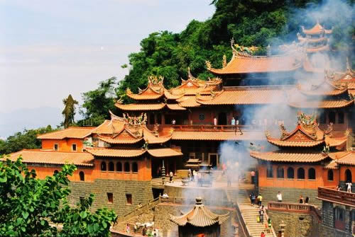 蓬萊祖殿為清水巖的主體建筑,創(chuàng)建于宋代。它依山臨壑,外觀呈“帝”字形,七妙地將人工建筑與自然巖壑融為體,古典雅,輪奐輪閏正殿為重檐山頂?shù)臉情w式建筑,由昊夭口、祖師殿、釋迦樓三部分組成,大殿兩側(cè)有檀樾廳、觀音廳、芳名廳、齋房、客舍等等,鱗次櫛比,相傳共有九十九間。蓬萊祖殿無(wú)論在建筑布局還是建筑風(fēng)格以及雕技術(shù)、裝外飾工藝方面都頗具特色,是福建省重點(diǎn)文物保護(hù)單位。 |