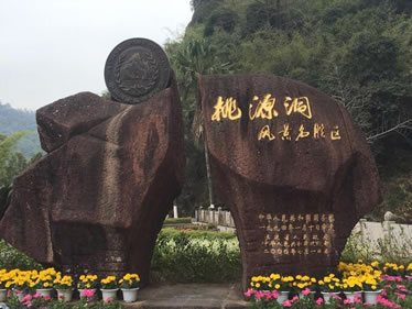 特殊地貌形成兩邊懸崖對峙,這條小澗叫桃花澗,從景區(qū)深處流出,我們的游路也將沿著高山峽谷的縫隙向內(nèi)延伸。桃源洞本沒有“洞”,無論是步行,還是泛舟游覽,都給人一種洞口的感覺右壁的懸崖高達120米,“桃源洞口”四個大字刻在36米高處,是明萬歷年間,辭官回永安的名士陳源湛于1605年所題,每字兩米見方。