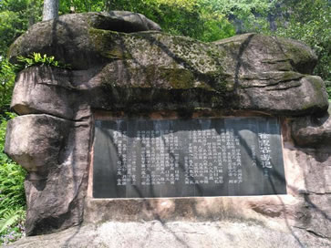 這塊巖石平整如盤。相傳,仙人常降臨這里對弈下棋。巖壁上刻的這兩個篆體字叫“奕臺”!稗呐_”邊上這搖搖欲墜的石頭,風吹石動,名曰:“飛來石”。巖壁上還有摩崖石刻“化極磐”三個字,帶有佛教語的味道,意思是:進入幻想中的靈變超脫境界。