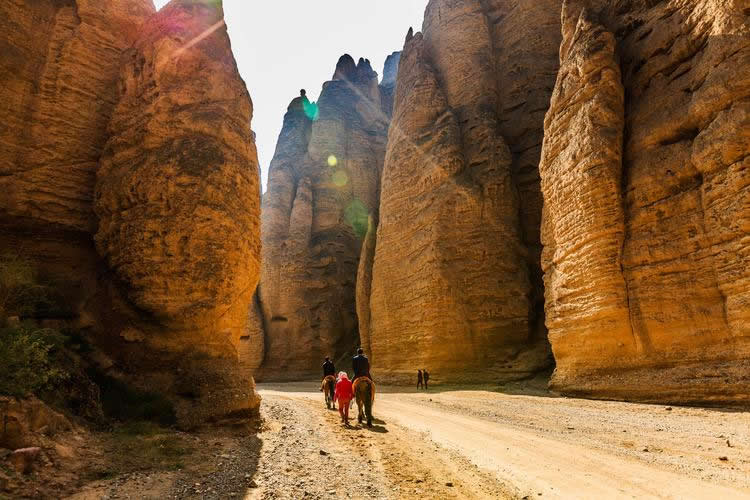 這里的石柱石筍大多高達八十至一百米之間,最高達二百多米,均由橘黃色砂礫巖構成,鬼斧神工,猶如雕塑大師之夢幻杰作。我們左行至飲馬溝入口,換乘當地農民裝扮得極富民俗風情的驢車前行。進入峽谷,兩邊布滿了巨大的石筍、石人、石鐘、石崖、石窟,峰回路轉,步移景變,人們將石景命名為:大象吸水、千帆競發(fā)、伴侶駝、“黃河母親”等等,其形神兼?zhèn),栩栩如生?/p>