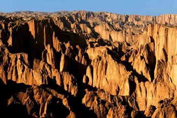 石林則依著黃河的彎轉,藐著黃河的水流,這個場面保持著一種驚心動魄的興奮,一看就是飛逝而去的千萬年啊,千萬年。老龍灣像一條長長的、波光粼粼的跑道,黃河拍打著細浪,從聳立的石林中,陡峭的巖石旁流過去,固執(zhí)地向干涸遙遠的北方挺進。風吹過,水涮過,千萬年的歲月,靈動和冥想,一路歌舞狂歡。突然一剎那就是永恒。停在那里回轉的頭型,飄飛的發(fā)絲,閃逸的裙裾一下子被動結了,面目間的笑意還沒有來及抹去。假如有一天,您也來到石林,是否會為這一片晴朗而遼闊的天空下毫無造作、天然凝就的靈魂而感動和震撼?大自然的神筆飛揚,你縱然放開想象,馳騁神思。望尖銳或圓錐狀的山峰,基部相連的簇狀,是石林發(fā)育地貌形態(tài)。只要能夠聯(lián)想到的物象,毫無例外活生生矗立在你的眼前,仰觀景慕,活靈神現;你沒有想到的也一幕幕向你襲來,目不暇接。山峰如聚,峰嶺沸騰了一般,黃河石林以它非石非巖的特質,在這塊土地上托起一個立體的神話。雅丹、丹霞、峰林為一體的地貌奇觀寫意了恢弘的場景,刀鋒擁擠,千軍涌動,萬馬奔騰,這儼如一個拼殺的戰(zhàn)場,風行走其間鼓動著金屬碰撞的鏗鏘,它不再是一個夸張的舞臺,場面不再是一個宏大的舞池。穿越石林,我們不自主地感知黃土高原的陽剛的軀身,緘默的神態(tài),堅毅的面容,它在風雨中矗立,日復一日,從不愿放棄對大地的眷戀,對太陽的向往。