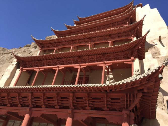閣樓依崖就窟而起,下八層為五間六柱大型兩角窟檐,檐角上翹,有線脊,下垂風(fēng)鐸(俗稱鐵馬)。第一層正對(duì)本窟巨型窟門,第四層和第七層各對(duì)洞窟明窗。第九層為八角頂,上豎3米高寶瓶,窟、像即以此頂相覆,三者共融一體。據(jù)P.2762《張淮深勛德記》及《宋乾德四年重修北大像記》、1936年《重修千佛洞九層樓碑記》(此碑已毀,僅存錄文)記載,武周初建大佛時(shí),樓為四層。晚唐乾符年間(874—879),沙州歸義軍節(jié)度使張淮深重建,改四層為五層。宋乾德四年(966)沙州歸義軍節(jié)度使、托西大王曹元忠及其妻涼國夫人潯陽翟氏避暑莫高窟,將下兩層糟朽梁、柱拆換重建(上三層仍保存原建筑)。清光緒三十四年(1908),敦煌商民戴奉鈺集資重修,改五層為七層。1928年,劉驥德等合莫高窟住持喇嘛易昌恕等重建,改七層為九層,于1935年建成,即今之“九層樓”。