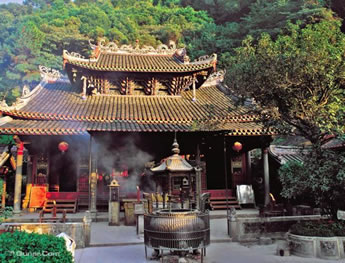 三絕:大雄寶殿后面山上綠樹(shù)繁蔭,但大殿屋頂上卻沒(méi)有一片樹(shù)葉,這究竟是什么原因?仍是個(gè)謎。