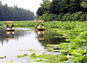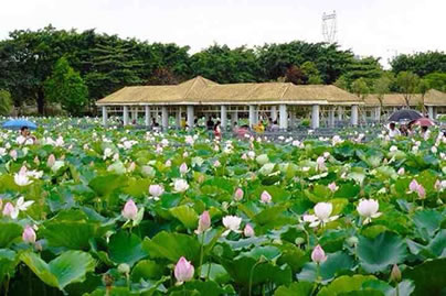 荷花園內(nèi)可觀賞到480個珍稀的荷花品種,其中有太空培育的“太空蓮”、遼寧省出土的 “古代蓮”等珍稀品種,數(shù)十個睡蓮品種,包括從臺灣引進(jìn)的四季花開的既可觀賞又可食用,同時(shí)還有較高的藥用價(jià)值的香睡蓮品種,以及各種罕有的水生植物。還有直徑達(dá)1.98米,可以承重40公斤的王蓮、以及形態(tài)萬千的數(shù)百個水生花卉品種。更種植了近100種各式各樣的奇瓜異果,更有直徑60公分,重達(dá)85公斤的巨型大南瓜、開花機(jī)率僅為十萬分之一的“并蒂蓮”奇觀,每年均數(shù)次競放荷花世界爭妍斗麗。并按個同功能劃分八大區(qū):文化廣場、中心 區(qū)、品種觀賞區(qū)、王蓮和睡蓮區(qū)、飲食娛樂區(qū)、生產(chǎn)科研育種區(qū)、籽 蓮區(qū)等組成。您可以乘車或徒步游覽景區(qū),也可以蕩舟在荷花叢中, 采摘蓮于、蓮藕,別有一番情趣。