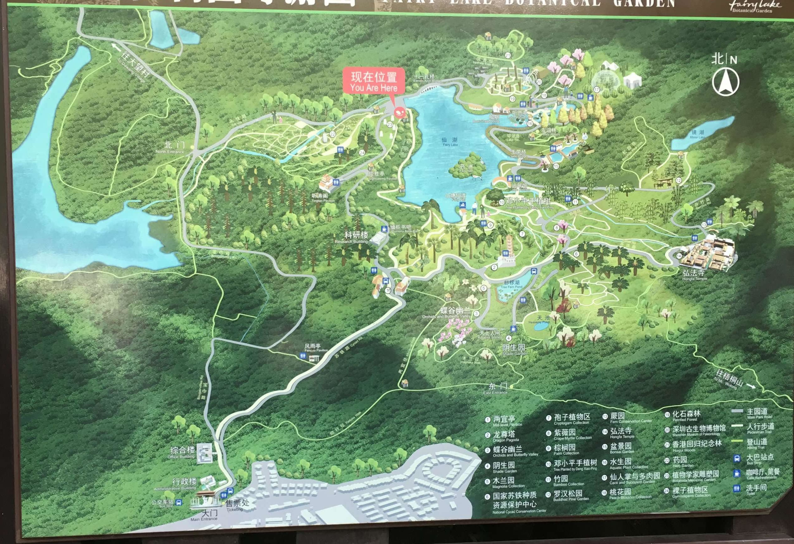 仙湖植物園共保存植物約8000種,建有蘇鐵保存中心、木蘭園、珍稀樹木園、棕櫚園、竹區(qū)、蔭生植物區(qū)、沙漠植物區(qū)、百果園、水生植物園、桃花園、裸子植物區(qū)、盆景園等21個植物專類園。