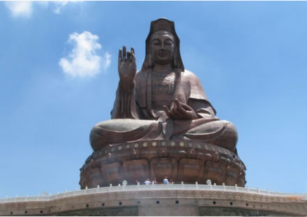 云海蓮臺(tái)地處西樵山風(fēng)景名勝區(qū)中心地帶,是以觀音文化為主題的大型景區(qū)。主要建筑有觀音法相、牌坊、影壁、放生池和浮雕等。觀音法相高達(dá)61.9米,是世界上最高的觀音造像。游客從北向入口,迎面聳立著一座六柱五門天柱牌坊,牌坊后隔著一個(gè)廣場(chǎng),建有影壁,用優(yōu)質(zhì)花崗巖雕筑,左右各設(shè)山門,壁后刻有觀音六字真言,漢文由九華山住持、安徽省佛教協(xié)會(huì)會(huì)長(zhǎng)仁德手書,藏文由西藏活佛親筆題寫。影壁上還刻有韋陀法像。影壁后為一放生池,池旁圍以蓮花作雕的白石欄桿,跨過放生池上的石拱橋,沿著283級(jí)開闊而整齊的石臺(tái)階,便可達(dá)觀音法像的蓮花座下。