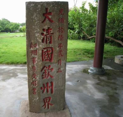 大清國(guó)一號(hào)界碑位于北侖河出?诘男∩狡律,碑高1.7米,寬0.7米,厚0.4米,用沿海所產(chǎn)的海蝕巖鑿成。界碑正面書(shū)“大清國(guó)欽州界·知州李受彤書(shū)·光緒十六年二月立”,涂著紅漆的莊嚴(yán)雄渾的大楷碑文透著一股不可侵犯的凜然正氣。這塊飽受長(zhǎng)年風(fēng)吹日曬雨淋而益顯滄桑的巨石,一直昂揚(yáng)地巍然屹立著,向每一個(gè)游客訴說(shuō)著100多年來(lái)的每一段歷史。
