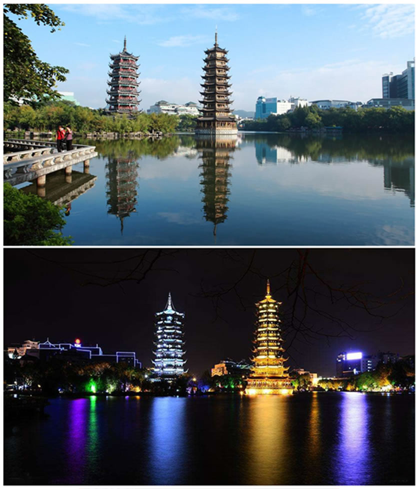 日月雙塔地處桂林市中心區(qū),坐落在桂林城的中軸線上,與“象山水月”相鄰。象山是桂林的城徽,而雙塔則是新桂林的標識。日塔、月塔與象山上的普賢塔、塔山上的壽佛塔,相互呼應(yīng),相互映襯,有“四塔同美”之說。桂林日月雙塔號稱世界第一銅塔,是桂林旅游的一個夜景觀賞地。