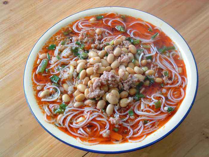 紅油米粉 紅油米粉是全州縣的傳統(tǒng)風(fēng)味小吃之一,是本地人的早點,主要以:米粉、肉湯打底,紅油浮面,綠蔥點綴。