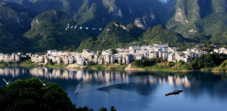 “紅水河第一灣”是國(guó)家AAAA級(jí)景區(qū),位于三石鎮(zhèn)板文村。紅水河在流經(jīng)東蘭縣板文村境內(nèi)拐了一個(gè)大彎,形成一個(gè)“U”字型的大峽谷,山環(huán)水繞,碧如玉環(huán),中間主峰如神龜靜臥,兩岸峰叢對(duì)稱排開,谷底河灘幾十個(gè)水譚或?qū)ΨQ、或連通,奇妙非常。山間林木翠綠蔥蘢,獼猴跳躍,百鳥爭(zhēng)鳴。在山頂上銅鼓觀景玻璃臺(tái)觀賞第一灣奇景,若在晨起碰到云霧天氣,霞光普照,霧繞神灣,幻若仙境。有詩(shī)描述:“一灣驚天下,回首造高峽,千山還壯美,奔流再出發(fā)!”該景區(qū)是紅水河的精華河段,是攝影、探險(xiǎn)、休閑度假的好地方。