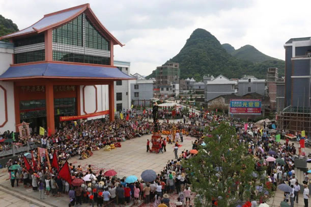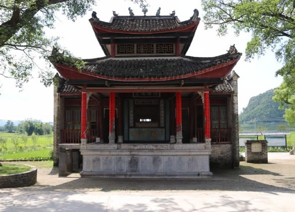 位于鐘山縣城西面公安鎮(zhèn)大田村,距縣城約十公里,此戲臺建于清光緒四年(即1878年),為磚、石、木結(jié)構(gòu),呈凸字形,通高10余米,由前臺和后臺 組成,前臺面寬6.37米,深5.5米;后臺寬10.12米,深3.6米;基高1.8米。整座戲臺青石青磚,雕工極為精美圓潤,八柱梁構(gòu)架,八角藻井復(fù) 頂,鼓石墊柱,青磚砌墻,青石為基,基旁雕以八仙賀壽,鑿雙龍以戲珠,臺上鏤兩虎以扶角,嵌二獅以呈瑞,后屏風(fēng)飾以山川樓閣,彩鳳仙鶴等木雕,工藝精湛, 構(gòu)圖和諧。戲臺除古樸典雅、雄偉壯觀,且符合力學(xué)、聲學(xué)原理,整座戲臺屬水口廟附屬建筑,隱映于古樹秀竹之中,清澈的溪流環(huán)繞其中,整個環(huán)境優(yōu)雅別致,清 靜恬適,為廣西不可多見的古戲臺之古代建筑之一。1981年列為廣西壯族自治區(qū)重點文物保護單位。該戲臺所處村莊大田村也是一個很有特點的村莊,老屋、古 榕、古樟在池塘的映襯下顯得特有韻味。