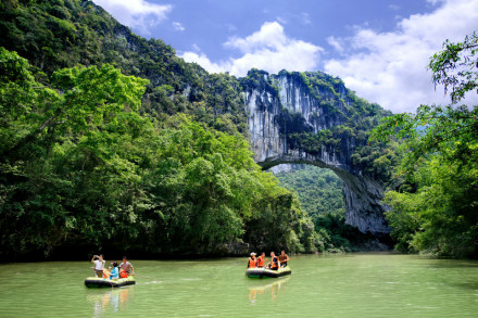 布柳河仙人橋景區(qū),地處樂業(yè)縣新化鎮(zhèn)磨里村布柳河大峽谷,距縣城51公里,該峽谷全長16.9公里。沿河兩岸綠樹成蔭,古樹繁多,野猴成群,鳥語鳴啼,有“植物的王國,鳥類的天堂”之美稱,河里魚兒穿梭,既可漂流,又可觀光旅游,被專家稱為“桂西第一漂”。尤為奇特的是,布柳河上還有一座由三座大山塌陷形成的天然石拱橋,坐落于漂流河段下游。石橋天成,鬼斧神工,橋拱對稱,拱底平滑,當?shù)厝朔Q為“仙人橋”。仙人橋拱孔跨度177.14米,橋?qū)?9.3米,橋身長280米,橋身厚78米,總橋高165米,拱高87米,像一條巨龍橫跨在河的兩岸,絕景天成,氣勢雄偉,是罕見的天然石拱橋。被專家稱為世界上最大、最美的水上天生橋,具有極高的觀賞價值。